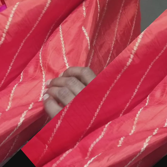 Celebrate in grandeur with this beautiful designer Banaras pattu saree in vibrant orange featuring golden zari peacock border, all-over strips design, and bright pink blouse with booti design.