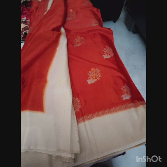 Look elegant in this Russian silk soft fancy pattu saree in vibrant orange featuring all-over floral bootas with cream color pallu and blouse. Very elegant and fast-moving!