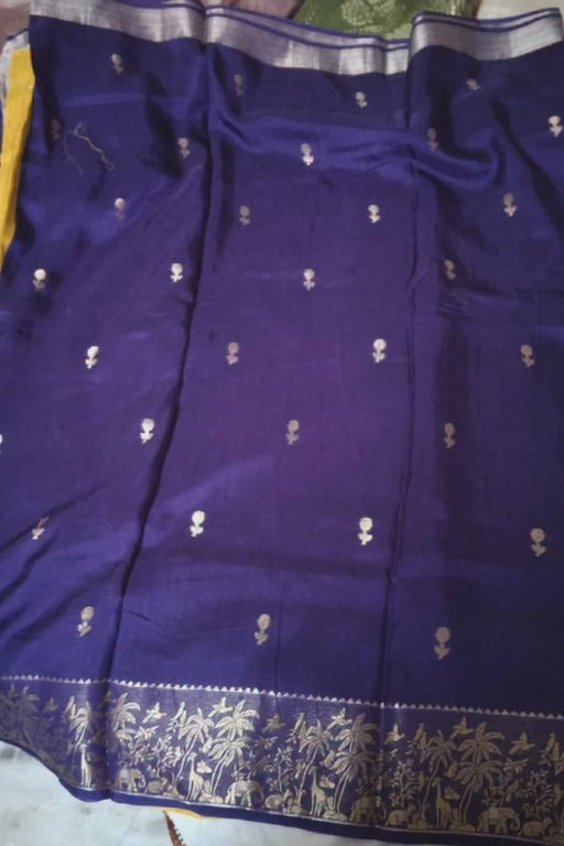 Make a stunning impression with this soft fancy pattu saree in rich dark violet (appears like dark blue) with elegant zari border and contrasting soft mango yellow tissue blouse.
